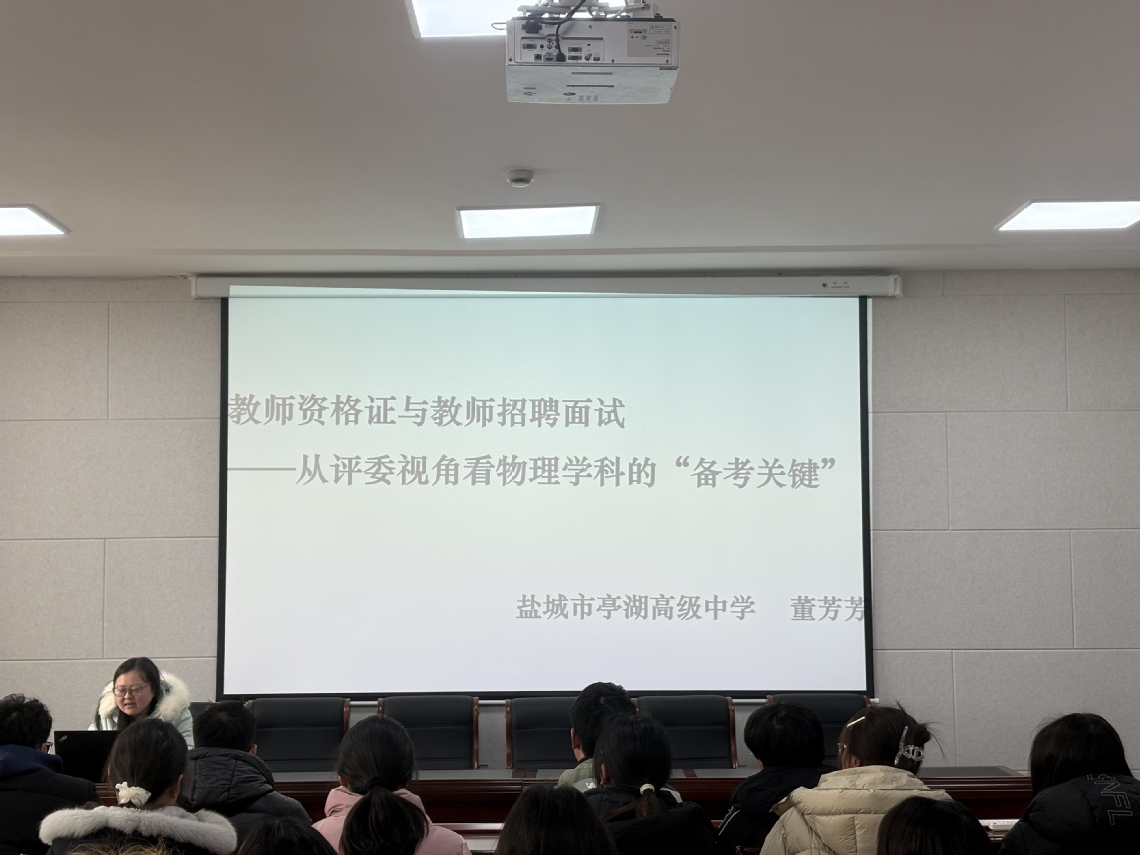 两位名师结合一线教学与评审经验,带来兼具理论深度与实操性的干货分享。潘国盛聚焦“学科育人”课题研究与教学实践,结合重点课题拆解研究思路、实施路径,详解国家工程素材融入高中物理课堂的方法,同时针对教师考编面试流程、现场表现等给出务实备考指导;董芳芳立足评委视角,拆解物理学科教资与教师招聘面试考察核心,点明学科功底、教学潜质、课堂驾驭力等核心素养,勉励学生打磨教学设计、规范板书表达,夯实综合从教能力。