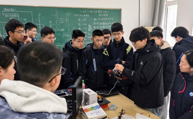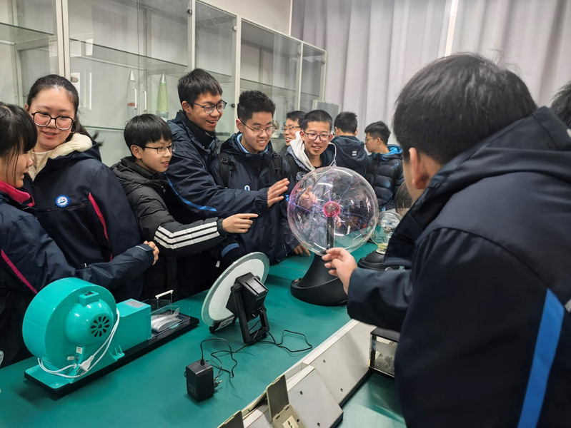 同学们走进实验室,在老师和志愿者的讲解下,对各类实验项目产生了浓厚兴趣。在龙芯生态联合创新实验室,学生志愿者向同学们展示了嵌入式芯片与系统设计竞赛作品,同学们对各种DIY汽车模型表现出极大好奇。在演示物理实验室,同学们亲自动手测量人体电阻,触摸辉光球感受万伏电弧的舞动…..抽象的物理概念在这一刻转化为直观生动的实验现象。在近代物理实验室,老师重点介绍了连续波核磁共振实验、塞曼效应等微观粒子相关实验,当了解到核磁共振技术与量子科技前沿及人民生命健康密切相关时,同学们对“学得文武艺,报效祖国和人民”的内涵有了更加深刻的体悟。在大学物理实验室,老师围绕中学生物理竞赛相关实验项目进行了系统讲解,重点解析实验考核要点,为同学们备战物理竞赛奠定了良好基础。