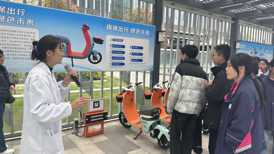 在灵感补给站,志愿者结合机械臂咖啡机、智能五谷机等设施,讲解光伏技术应用与人才服务场景融合的设计理念,介绍518米光伏步道年发电3.3万度、自主保障园区照明的绿色成果。在零碳氢行车站,志愿者详细解读光伏制氢、储氢、用氢全链条技术,展示氢能自行车10秒极速换氢、零碳续航的前沿应用,呈现盐城首个氢能综合应用示范场景的科技魅力。